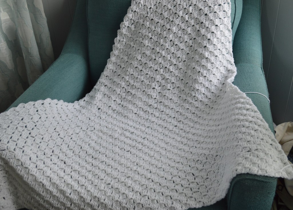 The only tricky parts were at the beginning and ending of rows. On the first half of the blanket, you are increasing, and in the second half, you are decreasing. Here is a great video to watch that will help you by The Purple Pancho.